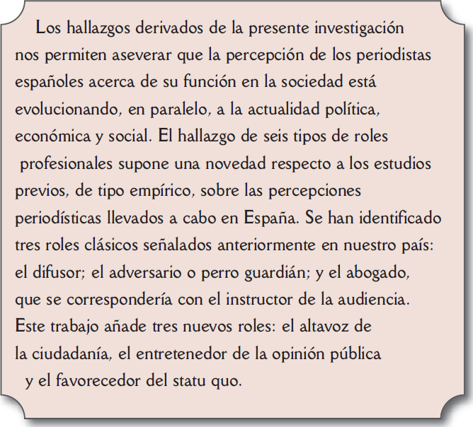 Los hallazgos derivados de la presente investigación nos permiten aseverar que la percepción de los periodistas españoles acerca de su función en la sociedad está evolucionando, en paralelo, a la actualidad política, económica y social. El hallazgo de seis tipos de roles profesionales supone una novedad respecto a los estudios previos, de tipo empírico, sobre las percepciones periodísticas llevados a cabo en España. Se han identificado tres roles clásicos señalados anteriormente en nuestro país (Canel & Sánchez-Aranda, 1999; Canel & al., 2000; Hanitzsch, 2011): el difusor; el adversario o perro guardián; y el abogado, que se correspondería con el instructor de la audiencia (tabla 3). Este trabajo añade tres nuevos roles: el altavoz de la ciudadanía, el entretenedor de la opinión pública y el favorecedor del statu quo.