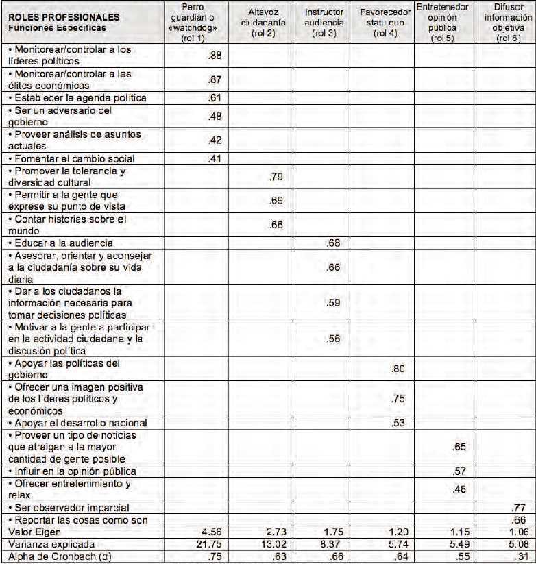 Tal y como se puede observar en la tabla 1, cada uno de los 21 ítems incorporados presenta una carga significativa en alguno de los 6 factores que sugiere el AFE como estructura latente (varianza explicada=59,46%; KMO=.77; Test de Barlett: p<.001). La consistencia interna de cada factor, o constructo, medida con el estadístico Alpha de Cronbach, mostró una fiabilidad adecuada, por norma general, en cada uno de los roles periodísticos identificados1, respetando el valor mínimo sugerido para estudios de carácter exploratorio: .60 (Hair & al., 1999; Robinson & al., 1991).