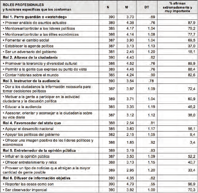Media (y desviación típica) de cada uno de los roles periodísticos, acompañados de las funciones específicas que los conforman