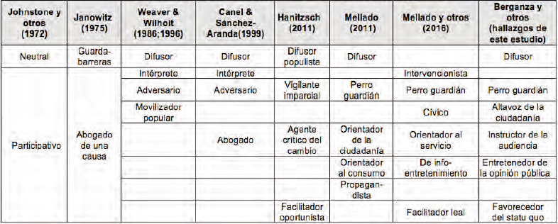 Más recientemente, Mellado y sus colaboradores efectuaron una comparativa transnacional para apuntar las funciones periodísticas predominantes en el contexto mediático latinoamericano. Partiendo de un análisis de contenido aplicado a 18 periódicos, constatan la presencia de seis roles, algunos de los cuales habían sido identificados, como se verá más adelante (tabla 3), en investigaciones precedentes: el intervencionista, el perro guardián, el facilitador leal, el orientador al servicio, al «infoentretenimiento» y, por último, el cívico (Mellado & al., 2016).