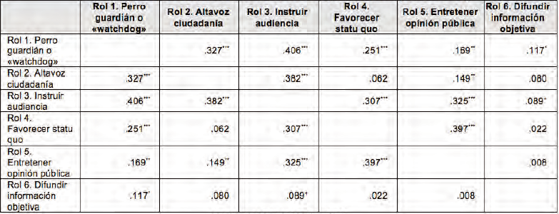En función de los datos contenidos en la tabla 4, la correlación más elevada es la que se produce entre el rol de perro guardián e instruir a la audiencia [r (388)=.406; p<.001]. También vemos que instruir a la audiencia se relaciona con el de altavoz de la ciudadanía [r (388)=.382; p<.001]; mientras que ejercer de perro guardián y ser altavoz de la ciudadanía también se vinculan en gran medida [r (388)=.327; p<.001]. Del mismo modo, favorecer el statu quo se asocia muy significativamente con entretener a la opinión pública [r (388)=.397; p<.001]; un hecho que hace entrever dos bloques de periodistas bien diferenciados entre sí.