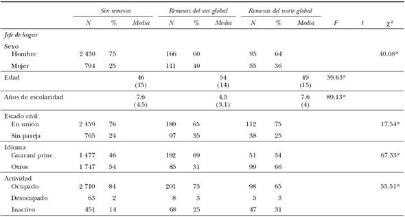 En el cuadro 2 se presentan las estadísticas descriptivas y el análisis bivariado de tres grupos de hogares de manera comparativa: a) hogares que no reciben remesas, b) hogares que las reciben del sur global, y c) hogares que las reciben del norte global. Se presentan las características sociodemográficas del jefe y de los hogares. La hipótesis que sostenemos es que existen diferencias sociodemográficas en estos grupos de hogares vinculadas a diversos procesos migratorios. Investigaciones previas sugieren que los hogares vinculados al norte global se encuentran en mejor posición económica que los que reciben remesas del sur global (Gómez, 2013); sin embargo no se han analizado las especificidades de los patrones sociodemográficos de estos hogares. La migración hacia Argentina, y Brasil en menor medida, es de larga data, con redes consolidadas, en tanto que la migración hacia España es relativamente reciente.