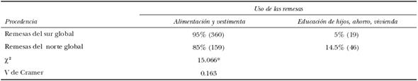 La evidencia empírica analizada sugiere que existen diferencias sociodemográficas y socioeconómicas entre los hogares vinculados al norte global y aquellos relacionados con el sur global. El principal destino que se da a las remesas internacionales es en bienes de consumo y esto es más acentuado en los hogares receptores del sur global. Es decir, el estatus económico de los receptores condiciona el uso de las remesas. Mientras que los hogares con mejor posición socioeconómica y que reciben del norte invierten un porcentaje mayor en actividades consideradas productivas, aquéllos con niveles socioeconómicos más bajos y que reciben del sur invierten en satisfacer necesidades de consumo básicas. La frecuencia en la recepción indica que mayoritariamente son un reemplazo del salario y que esto es más acentuado en los hogares receptores del norte.