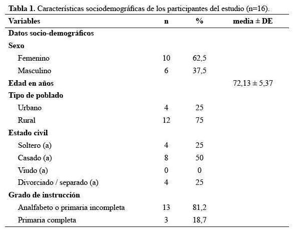 Con respecto al estado civil, el 50% eran casados dividiéndose el otro 50% entre solteros y divorciados; no se encontró ningún viudo. El 75% de los participantes provenían de área rural, solo 4 vivían en la zona urbana y la mayoría, el 81,2% eran analfabetos o tenían primaria incompleta (tabla 1).