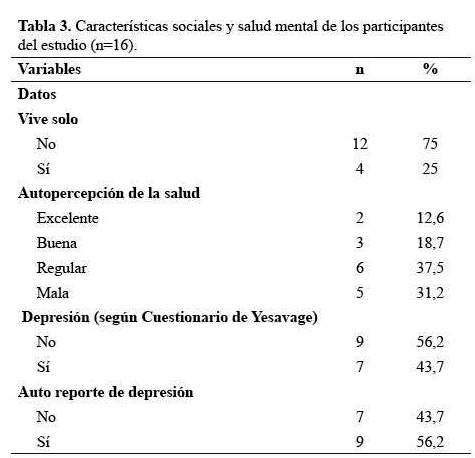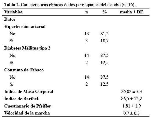 Al evaluar el área funcional y cognitiva, se evidenció que la mayoría de los pacientes presentaban un ligero grado de dependencia teniendo como promedio el Índice de Barthel de 86,5 con DE de 12,2 y una función intelectual intacta teniendo como resultado un Test de Pfeiffer promedio de 1,81 con DE de 1,9. La velocidad de la marcha promedio fue de 0,7 m/s con DE de 0,3 (tabla 2). El 25% de la población encuestada dijo vivir solo; en cuanto a su percepción de la salud, el 37,5% respondió que siente tener una salud regular seguido del 31,2% que refirió tener mala salud. Para evaluar depresión, los encuestados respondieron el cuestionario de Yesavage encontrando que el 43,7% sí presentan depresión y el 56,2% refirió sentirse frecuentemente deprimido (tabla 3).