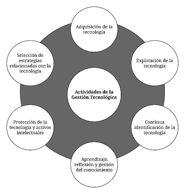 Badawy (2009:223), define gestión tecnológica como “la arquitectura o configuración de los sistemas de gestión, políticas y procedimientos que rigen el funcionamiento estratégico y operativo de la organización con el fin de alcanzar sus objetivos y metas”, el autor también hace referencia a la definición de The National Research Council: “La gestión tecnológica, vincula las disciplinas de ingeniería, ciencia y gestión, para la dirección, planeación, desarrollo e implementación de las capacidades tecnológicas y configurar y lograr los objetivos estratégicos y operativos de una organización”. Cetindamar et al., (2016:2) explica que la gestión tecnológica consiste en “planificar, dirigir, controlar y coordinar el desarrollo e implementación de las capacidades tecnológicas para lograr los objetivos estratégicos y operativos de una organización”. Define las capacidades tecnológicas como una serie de seis actividades encaminadas a la mejora o desarrollo de productos, procesos y tecnología existentes, éstas actividades, se muestran en la figura 1 y son: “1) adquisición de la tecnología, 2) explotación de la tecnología (comercialización, desarrollos incrementales, mejoras de procesos y comercialización), 3) continua identificación de la tecnología en las diferentes etapas del ciclo de vida de desarrollo y mercado, 4) aprendizaje, reflexión sobre los proyectos y procesos de tecnología utilizada, relacionada además con la gestión del conocimiento, 5) protección de la tecnología y los activos intelectuales (patentes, derechos de autor, retención de capital humano) y 6) selección de estrategias relacionadas con la tecnología” (Cetindamar et al., 2016:3).