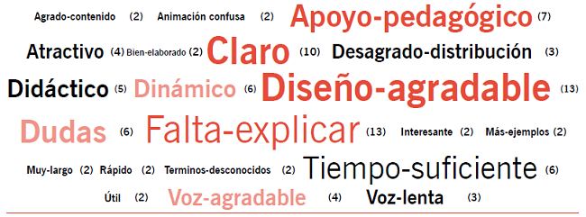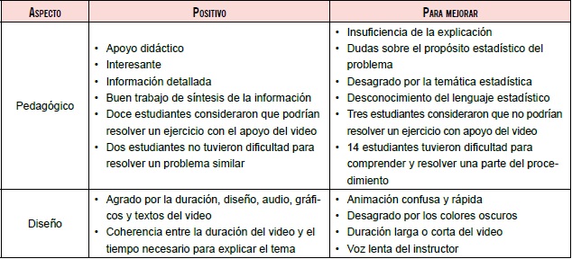 Otro aspecto relevante del diseño fue encontrar discrepancias en las opiniones de los estudiantes respecto a la voz del instructor; algunos mencionaron que era lenta y restaba dinamismo al video, mientras que otros señalaron que era rápida y agradable. Asimismo, hubo comentarios a favor y en contra sobre la duración. Algunos estudiantes comentaron que el tiempo era muy reducido para explicar la temática y otros, que el apoyo audiovisual fue extenso.