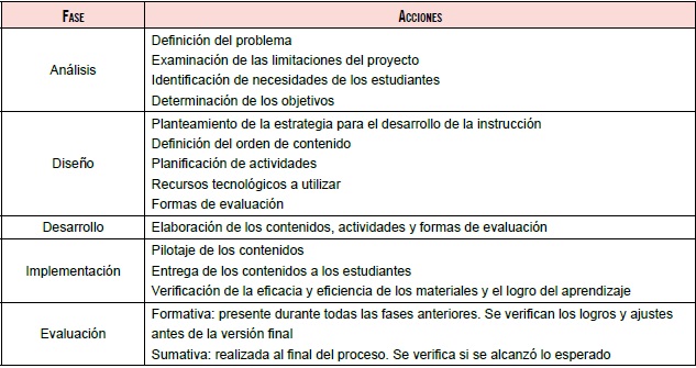 De acuerdo con Belloch (2013), existen diversos modelos de diseño instruccional, entre los cuales destaca el de análisis, diseño, desarrollo, implementación y evaluación (ADDIE), considerado un modelo genérico porque sus fases son esenciales en un diseño instruccional; estas se interrelacionan y permiten su adecuación para el logro de la instrucción (Belloch, 2013; Morales-González, Edel-Navarro y Aguirre-Aguilar, 2014; Moreno et al., 2014; Soto, 2013). La tabla 1 contiene una breve descripción de las acciones en cada fase del modelo ADDIE.