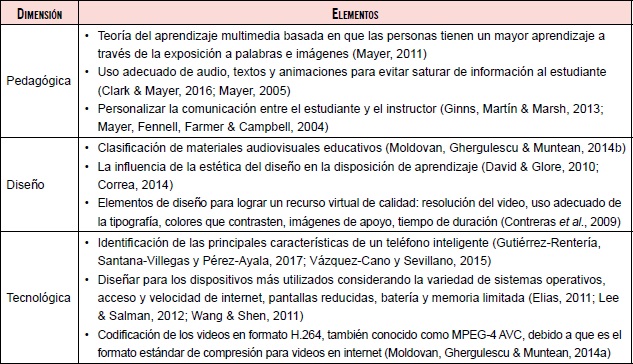 Contreras, Herrera y Ramírez (2009), Elias (2011) y Wang y Shen (2011) sugieren principios para guiar la elaboración de contenidos educativos para dispositivos portátiles. Estos autores abordan el diseño instruccional a través de dimensiones asociadas a elementos pedagógicos, de diseño y tecnológicos. Para fines de este estudio, retomamos las dimensiones que manejan y las complementamos con información considerada relevante en la revisión de literatura asociada al desarrollo de los contenidos educativos digitales (ver tabla 2).
