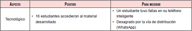 Sobre los elementos tecnológicos, encontramos que las fallas del dispositivo de un estudiante dificultaron su acceso al contenido educativo digital. Esta problemática destaca la necesidad de ofrecer al estudiante un diseño que pueda ser adaptable a cualquier otro dispositivo, así como facilitar otras vías para la distribución de los materiales.