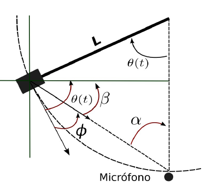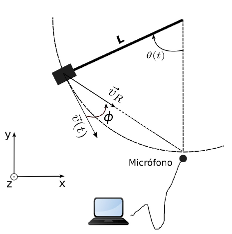 1. Se monta el dispositivo experimental de la figura 4, siendo conveniente que el péndulo tenga el mayor largo posible y se lo haga oscilar con una amplitud angular inicial grande (mayor de 45º), de modo de lograr la mayor velocidad relativa durante el pasaje por delante del micrófono del ordenador, y aumentar la variación de frecuencia del sonido respecto a la fuente. Los efectos de pandeo perpendicular al plano de oscilación pueden minimizarse con la rigidez de la barra y el poco roce del cojinete del eje del péndulo.