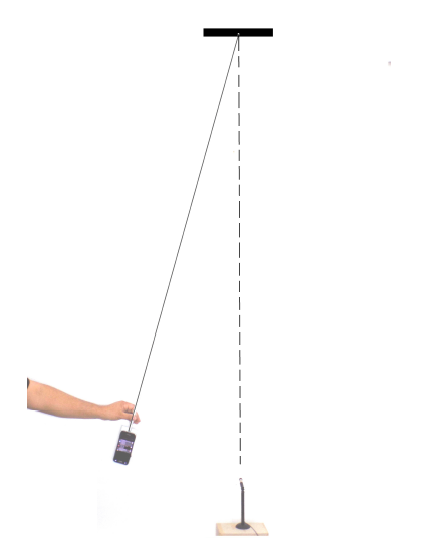 Para este experimento se utiliza un péndulo construido con una varilla delgada de aluminio de 1,75±0,02m, medida desde el eje de sujeción y hasta el altavoz del teléfono. El ángulo inicial que utilizamos es de ~60º respecto a la vertical y produce una rapidez máxima del bulbo de ~1 % de la velocidad del sonido. Para aumentar esta velocidad, puede aumentarse la longitud de la varilla o el ángulo desde donde se lo libera. El extremo de la varilla tiene un pequeño soporte que permite adherir dos smartphones. Uno de ellos genera un tono de frecuencia fija de 5000±1Hz, usando la aplicación Frequency Sound Generator y en forma simultáneamente registra la velocidad angular en función del tiempo con un período de muestreo de 10 ms. El segundo teléfono, solidario al anterior, graba el sonido emitido por el primero.