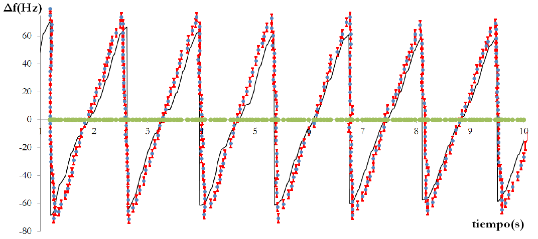 de los resultados experimentales) en función del tiempo. Los valores experimentales de la frecuencia fueron obtenidos a partir de las imágenes generadas con Spectrogram y extraídos con el analizador de imágenes XY-Extract.