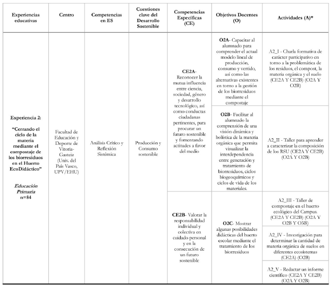 En este trabajo se plantea el diseño, implementación y análisis preliminar de una intervención didáctica en formación inicial del profesorado de Primaria para el desarrollo de dos competencias de ES: análisis crítico y reflexión sistémica (UNESCO 2014a). Se enmarca en un proyecto de innovación en sostenibilidad cuyo objetivo principal es consolidar y fortalecer el uso del huerto ecológico del Campus de Álava (Vitoria-Gasteiz) como recurso educativo. La intervención se llevó a cabo en el marco de la asignatura “Ciencias de la Naturaleza en el aula de Educación Primaria I”, que recoge, entre otras competencias específicas: