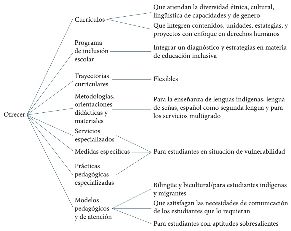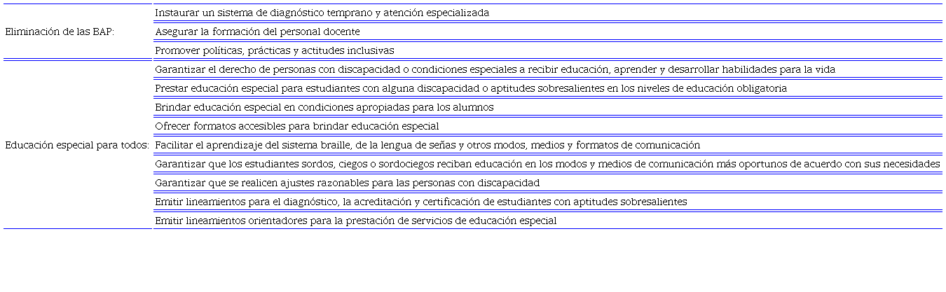 El artículo 7 fracción II del mismo documento determina que, para que la educación sea inclusiva, es necesario que: a) responda a las características, capacidades, necesidades, habilidades, estilos y ritmos de aprendizaje de todos los estudiantes; b) elimine las distintas BAP que enfrentan los estudiantes; c) establezca educación especial en todos los tipos, niveles y modalidades educativas; y d) provea los materiales y recursos técnico-pedagógicos necesarios para los servicios educativos (DOF, 2019b).