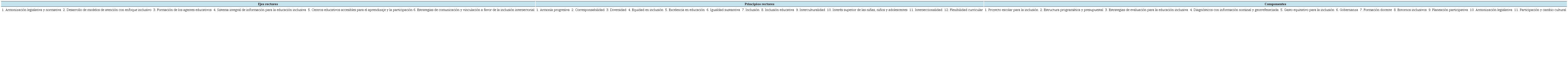 Así, a partir de tales lineamientos, la Estrategia nacional de educación inclusiva (ENEI) pretende convertir al SEN “en un sistema inclusivo, flexible y pertinente que favorezca el avance, permanencia, aprendizaje, participación y conclusión de los estudios de niñas, niños, adolescentes y jóvenes en todo el país, en su amplia diversidad, en igualdad de condiciones y oportunidades” (SEP, 2019b: 5). La ENEI está estructurada alrededor de 12 principios, 11 componentes y seis ejes rectores, los últimos con sus correspondientes objetivos, metas, acciones, instrumentos de medición y agentes responsables. En conjunto, estos documentos constituyen los textos de la política de educación inclusiva.