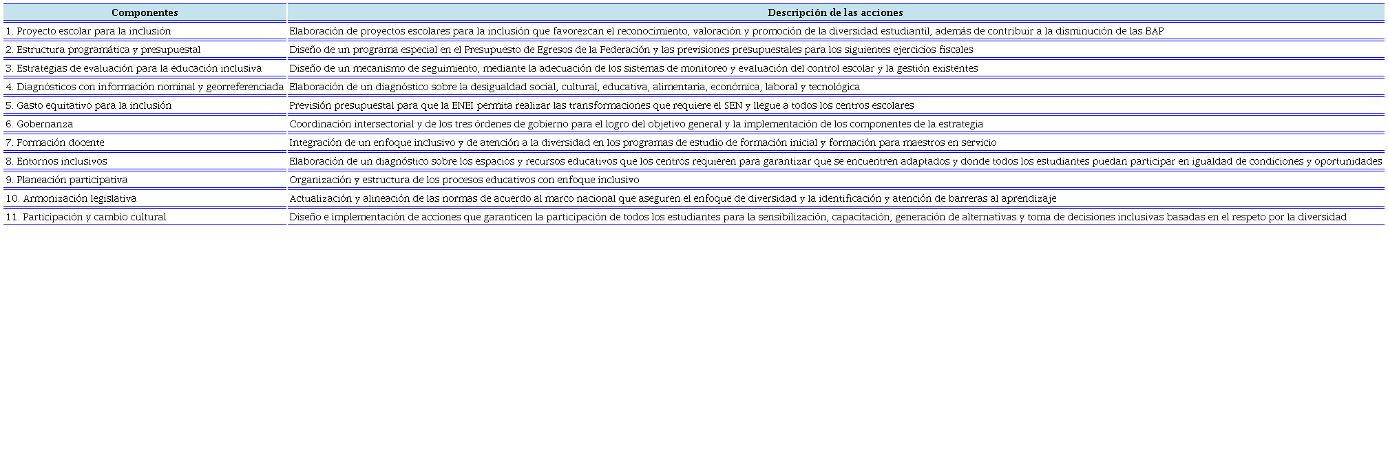 Como se observa en el Cuadro 2, los 11 componentes de la ENEI constituyen la base para el desarrollo de los 12 principios y los seis ejes rectores. Cada uno de ellos tiene particularidades. El Cuadro 3 agrupa sus 11 componentes y sus acciones específicas.