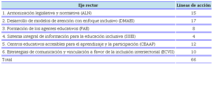 Por otro lado, la parte medular de la ENEI la constituyen los seis ejes rectores, pues de éstos se desprenden las líneas de acción. Cada eje cuenta con un objetivo particular e integra acciones de diversa índole para su cumplimiento. En total, la ENEI propone 66 líneas de acción distribuidas en los seis ejes, como se muestra en la Tabla 1.