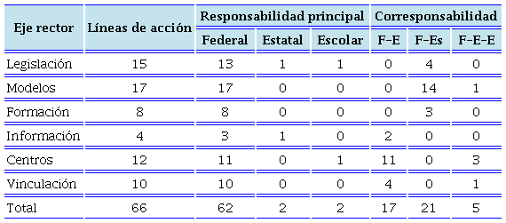 Como puede observarse, la mayor parte de las acciones planteadas en la ENEI son responsabilidad de la federación (62), y pocas son responsabilidad del nivel estatal (2) y escolar (2). Sin embargo, 43 de las acciones requieren de la corresponsabilidad entre los tres diferentes niveles de autoridad: 17 son responsabilidad de la federación y de la autoridad estatal, 21 de la federación y la escuela, y 5 de los tres niveles. Lo anterior indica que la estrategia es una propuesta centralizada, ya que la mayor parte de las líneas de acción recaen sobre la federación y sólo algunas sobre los estados; incluso existe mayor corresponsabilidad entre la autoridad federal y la escolar para la puesta en práctica de las acciones, lo cual, en algunos casos, implica que los gobiernos estatales serán utilizados como un puente entre los otros dos niveles.