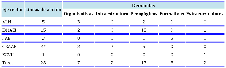 Del análisis emergieron cinco tipos de demandas hacia las escuelas: organizativas, de infraestructura, formativas, pedagógicas y extracurriculares. La Tabla 3 concentra el número de acciones y el tipo de demanda por eje rector enunciado en la ENEI.