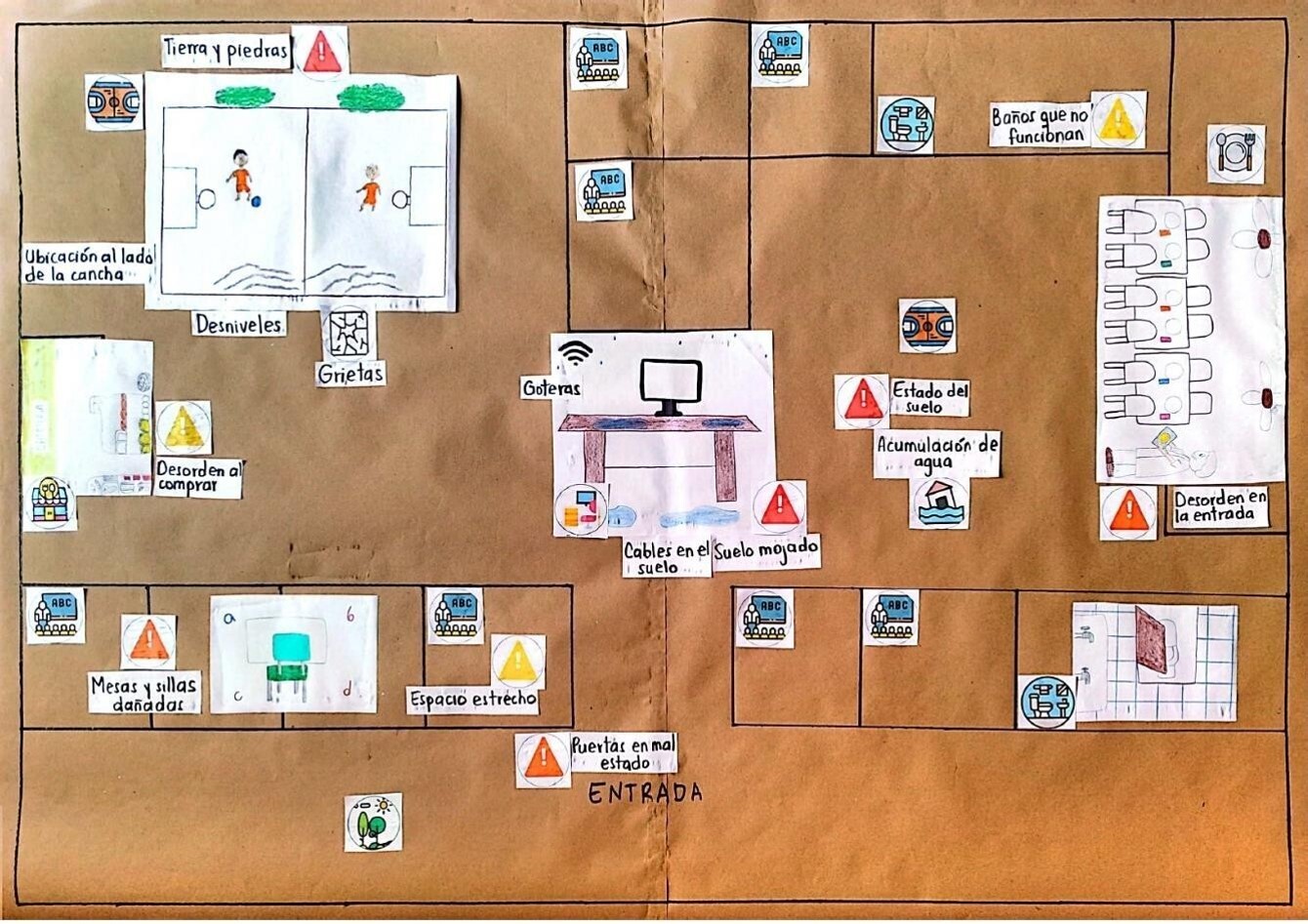 Estos productos reflejaron lo comprendido en el desarrollo de las actividades que componían cada sesión, pues evidencian las diferentes perspectivas y niveles de profundidad alcanzados por los estudiantes, al proponer y plasmar ideas comunes y creativas para reconocer los riesgos de su escuela y acciones a realizar ante ello.
