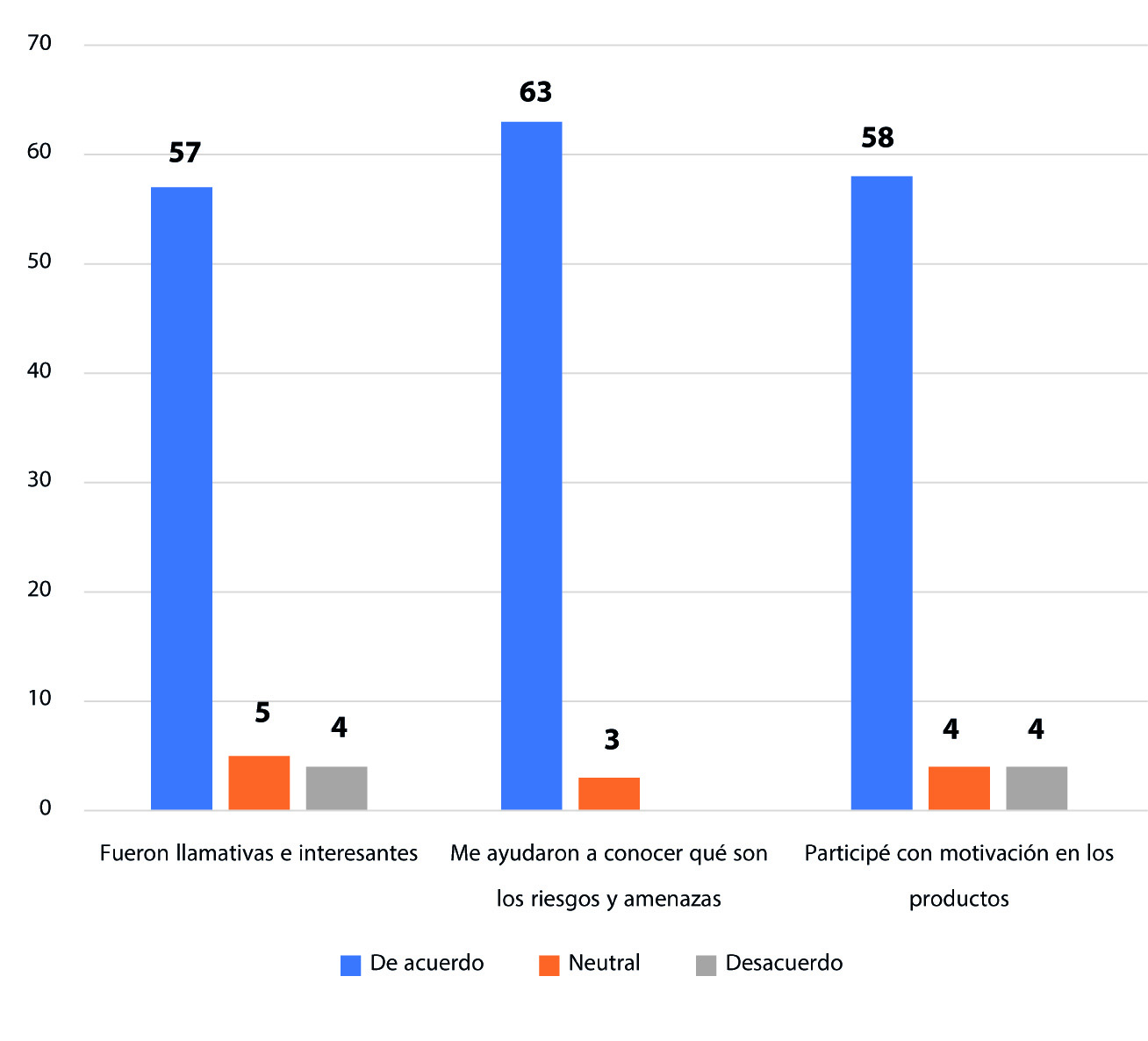 Los resultados mostraron un impacto significativamente positivo, evidenciado por un incremento superior al 86% en las respuestas de los estudiantes, lo que representó un cambio favorable en comparación con los resultados de las encuestas aplicadas inicialmente y reflejó, desde los ítems establecidos en la escala de Likert (figuras 14, 15 y 16), su interés por participar en las actividades planteadas y su contribución al reconocer los conceptos clave, fortaleciendo la capacidad de reconocer riesgos, amenazas y vulnerabilidades del contexto.