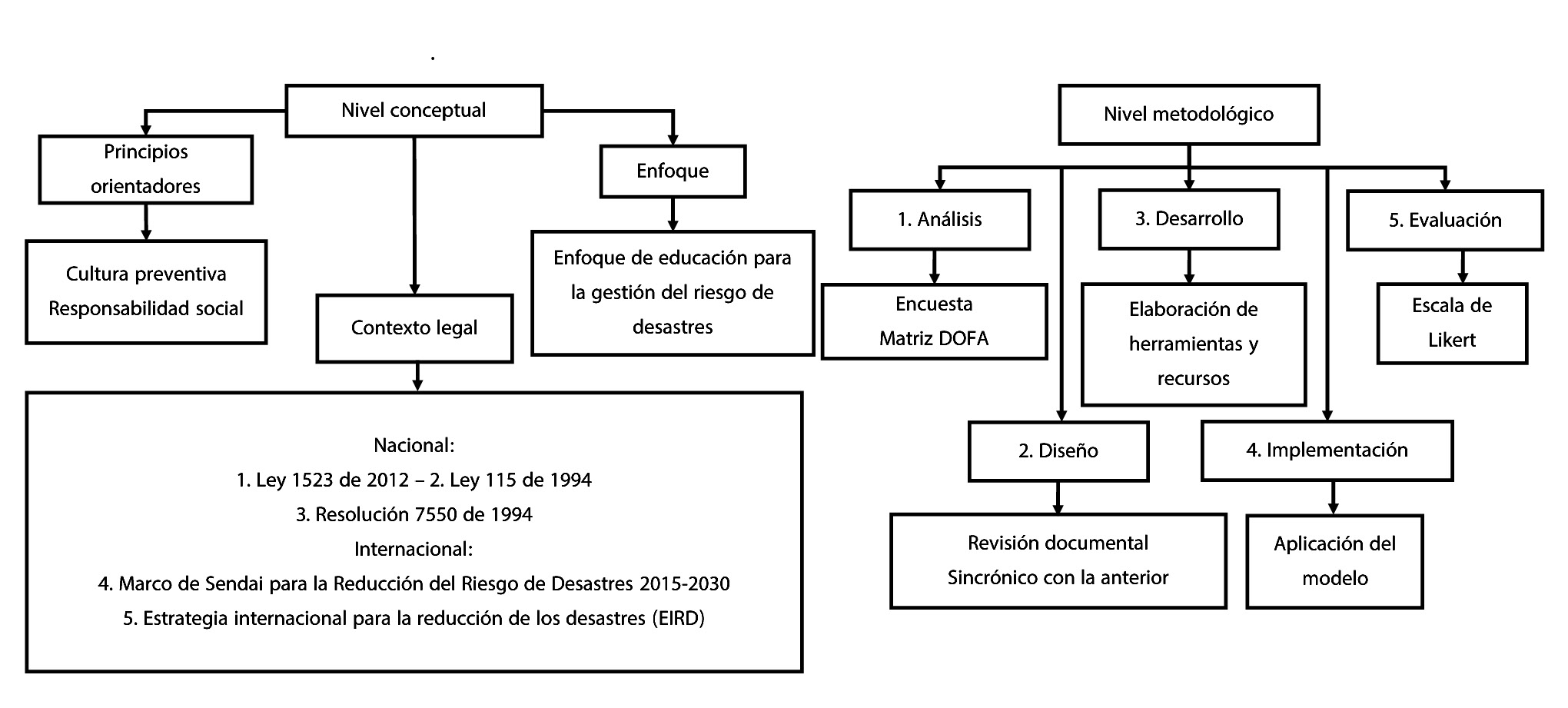 La responsabilidad de las instituciones educativas sobre la inclusión de la Gestión del riesgo como parte de la formación integral, enmarcada en la normatividad expuesta por el Ministerio de Educación Nacional, destaca el papel que tienen en la implementación de estrategias y planes que vinculen a la comunidad y fomenten en ellas conocimientos y habilidades que los lleven a reconocer, reducir y enfrentar las amenazas que pueden estar presentes en el contexto. Desde esta perspectiva, es posible promover el reconocimiento tanto teórico como práctico de esta gestión a partir del diseño y aplicación de un modelo didáctico que involucre estrategias que aborden conceptos básicos y ejercicios asociados con ello.