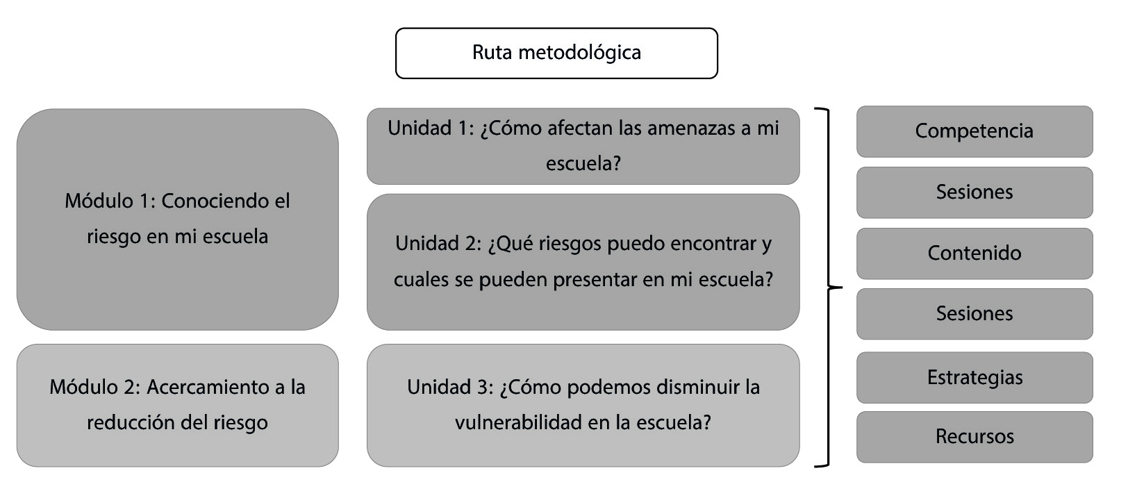 En la ruta mencionada se estructuró en tres unidades, cada una dedicada a explorar los conceptos fundamentales de amenaza, riesgo y vulnerabilidad. La metodología se basó en los procesos de gestión del conocimiento y reducción del riesgo, comenzando con la exploración de saberes previos de los estudiantes. Posteriormente, se profundizó en cada concepto a través de cartillas explicativas y se consolidó el aprendizaje mediante tres productos prácticos: álbum de amenazas, mapa de riesgos y afiches con acciones preventivas para el mural.