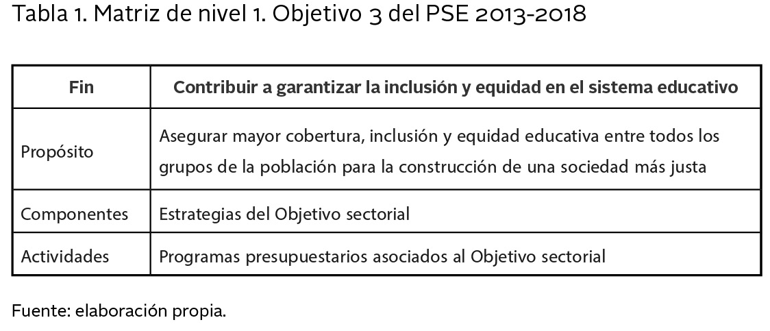 La tabla 1 presenta un ejemplo de cómo sería el Resumen Narrativo de una matriz de nivel uno utilizando el objetivo sectorial 3 de PSE 2013-2018 y que se definió como: “Asegurar mayor cobertura, inclusión y equidad educativa entre todos los grupos de la población para la construcción de una sociedad más justa”. Como se puede observar, la primera matriz o la de más alto nivel tendría como Propósito el objetivo sectorial mismo y el Fin sería el “contribuir a garantizar la inclusión y equidad en el sistema educativo” que es el objetivo 2 de la meta nacional establecida en el PND de ese mismo sexenio. Los Componentes de esta primera matriz son las estrategias del objetivo, mientras que las Actividades estarían compuestas por los programas presupuestarios asociados o vinculados a cada estrategia. Así, siguiendo el PSE 2013-2018, habría siete componentes (pues hay siete estrategias asociadas al objetivo sectorial 3 y 22 actividades (ya que para ese PSE se vincularon al tercer objetivo sectorial 22 programas presupuestarios).