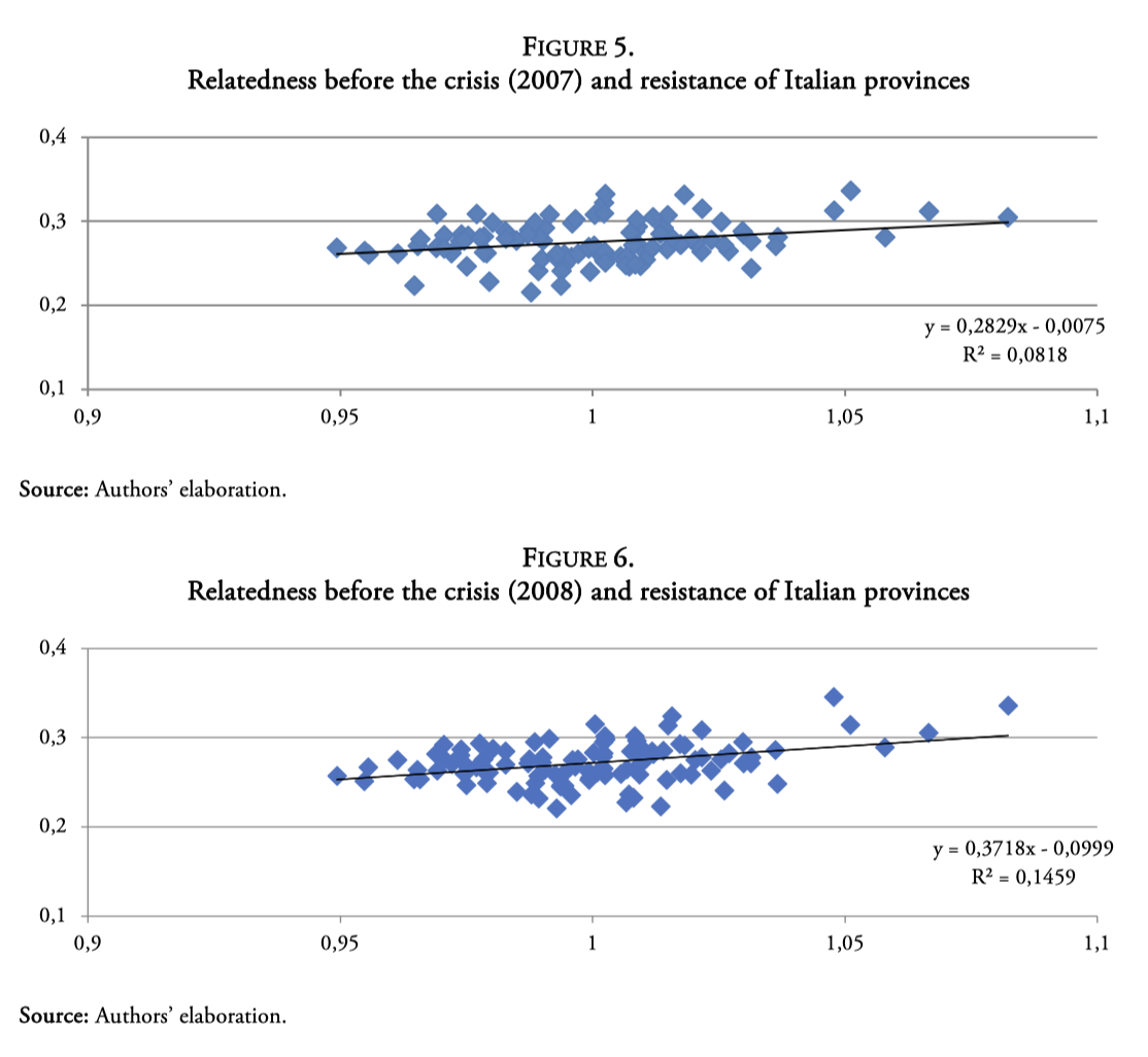 The results show how provinces that were following a strategy of diversification into related industries before the crisis resisted better to the great recession. This result is confirmed in the case of the relatedness of both years before the advent of the crisis.