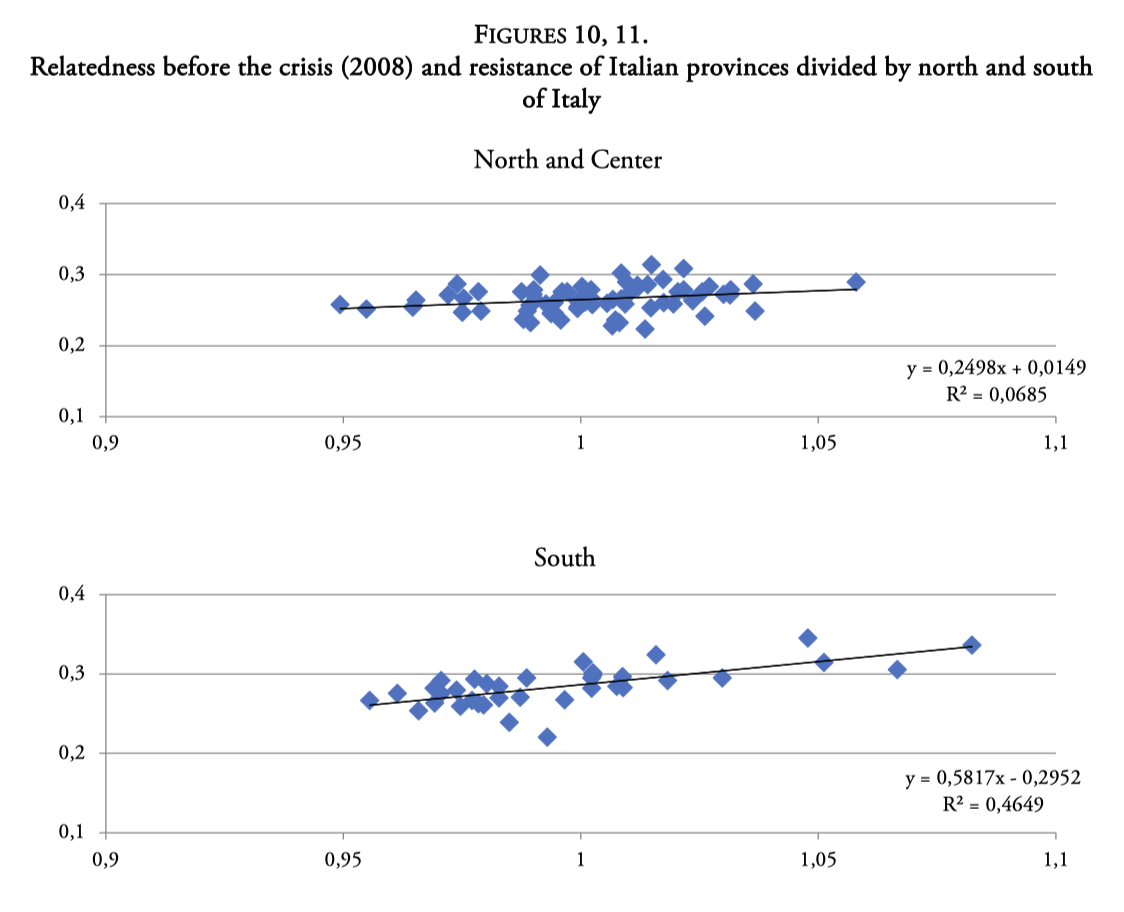 The results show that the positive association between the relatedness of new specialisations occurred in the period before the crisis and the resistance is strongly driven by the provinces located in the south of Italy. In fact, the results for the provinces located in the north-center are still positive but largely less robust than those of the provinces located in the south.