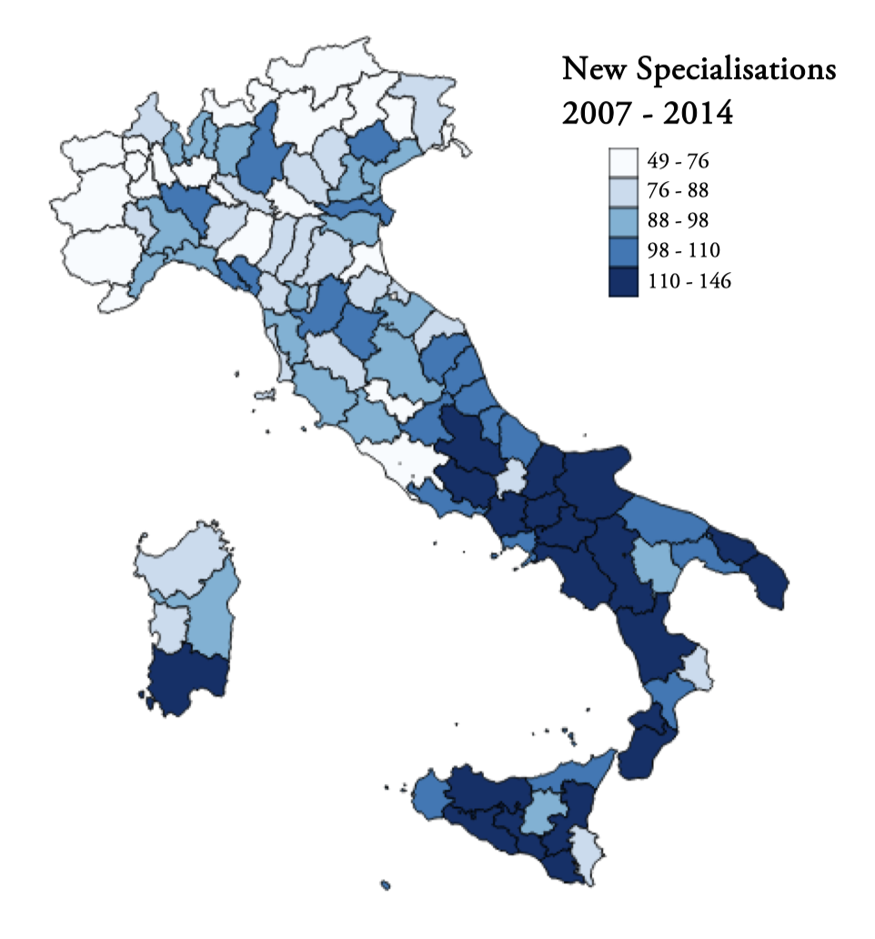 What it seems to emerge from an in depth analysis of the new specialisations occurred before the crisis and that drive the south into a higher resistance of those provinces specialising into related activities, is that they diversified their specialisations into activities more connected with the heavy industry and this lead to a higher capacity to absorb the shock in respect to the provinces located in the north of the country.