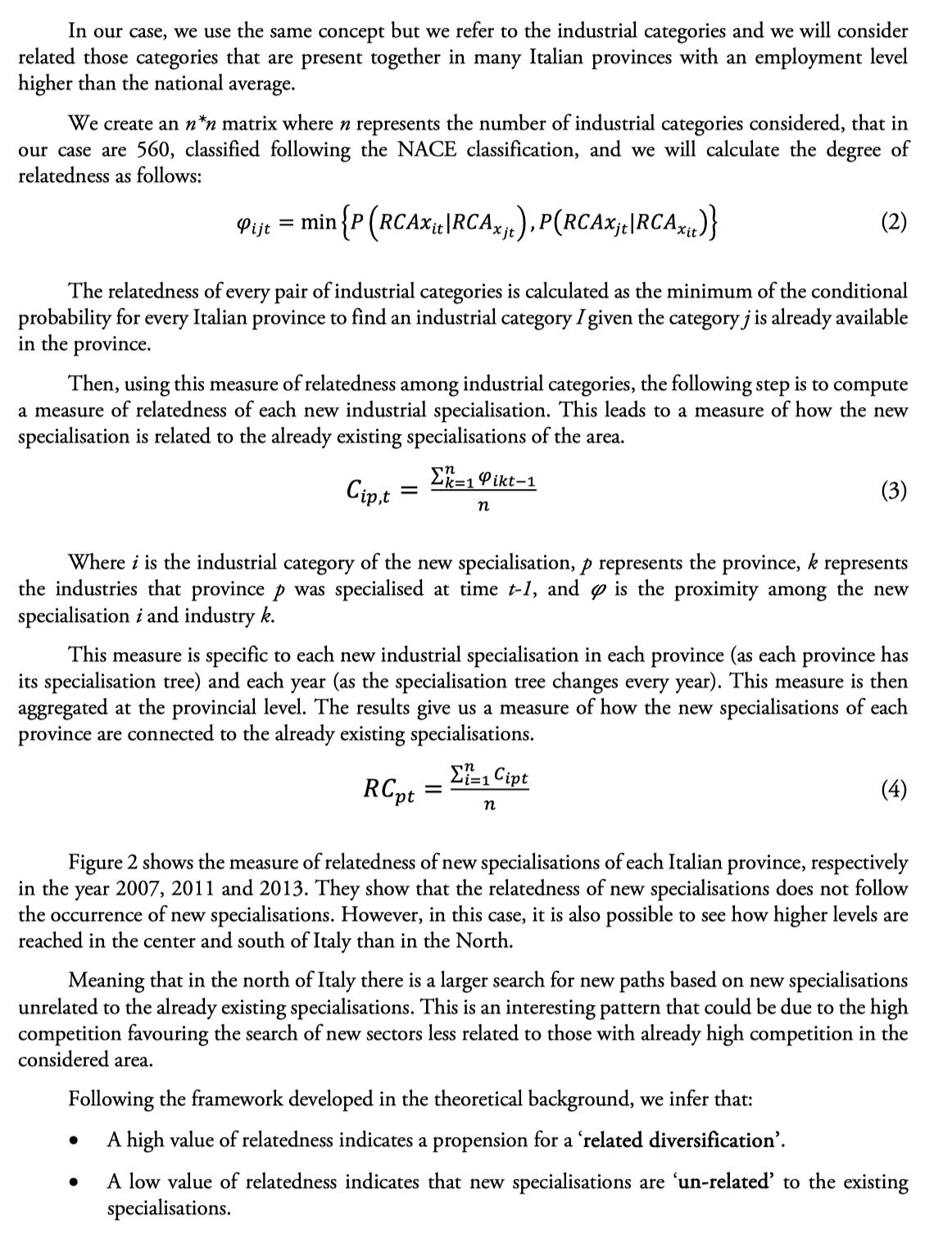 Moreover, sector-specific shocks may likely hit more diversified regions than regions with specialised economies. However, the damage will be less dangerous for the whole local economy because variety spreads risks among different sectors (Boschma, 2015). Frenken et al. (2007) reconduct the issue to the degree of ‘related’ and ‘unrelated’ variety of regions. In this regard, the concept of relatedness is particularly useful because it captures both dimensions and identifies the proximity of sectors that are usually not considered as close as they are.