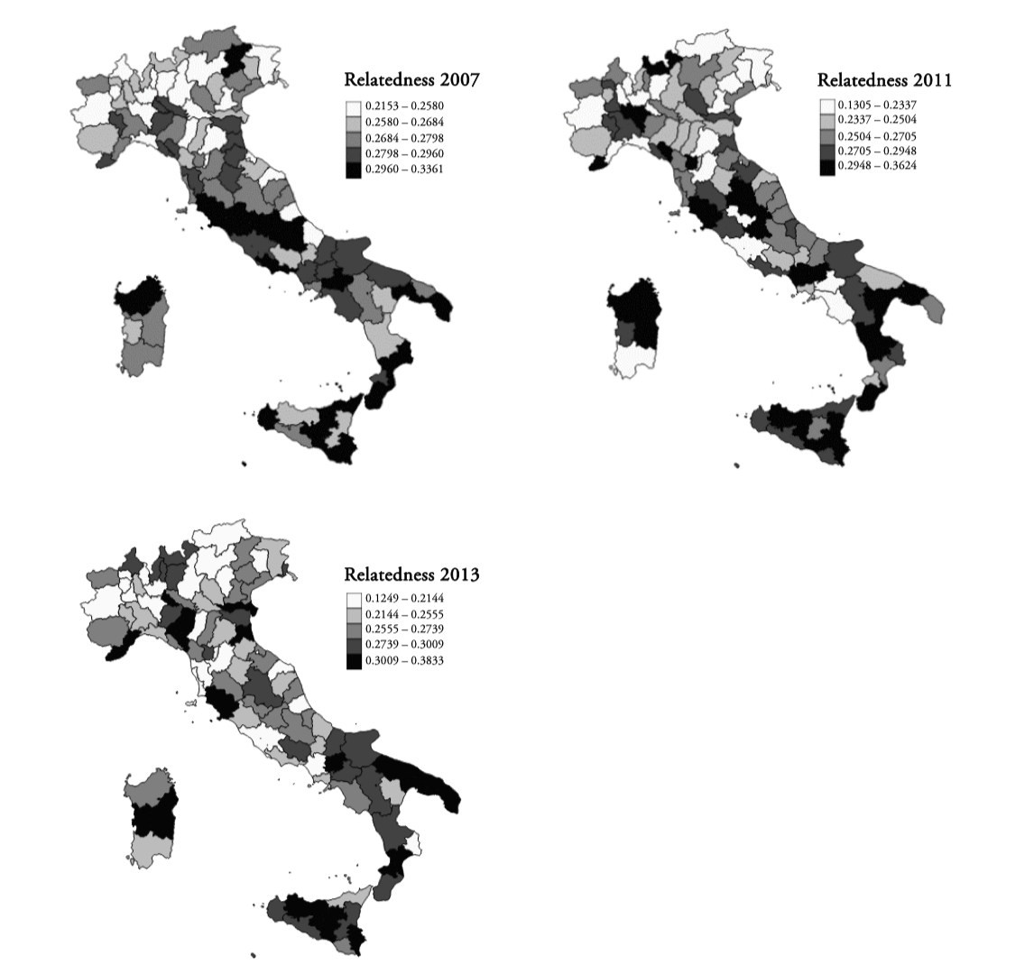 Meaning that in the north of Italy there is a larger search for new paths based on new specialisations unrelated to the already existing specialisations. This is an interesting pattern that could be due to the high competition favouring the search of new sectors less related to those with already high competition in the considered area.