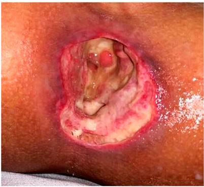 Se llevó a laparotomía exploratoria y se encontró peritonitis fecal por perforación de ciego de colon transverso (cerca al ángulo esplénico) y compromiso del 80% de la circunferencia del colon ascendente por microperforaciones múltiples, por lo cual se realizó hemicolectomía derecha, con resección de íleon a 5 cm de la válvula ileocecal hasta el ángulo hepático, quedando con abdomen abierto e ingresando a la unidad pediátrica de cuidados intensivos con soporte vasopresor. Se agregó al tratamiento metronidazol endovenoso. Se evidenció úlcera perianal de 2 x 2 cm, con fondo cubierto de fibrina (Figura 1).