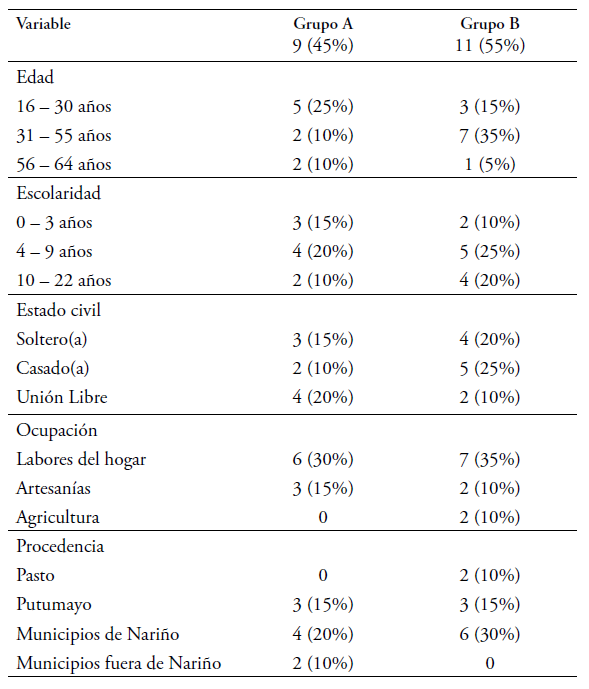 De esta manera fueron seleccionadas 28 víctimas del conflicto armado en Colombia, a quienes se aplicó criterios de inclusión previamente establecidos para el desarrollo del proyecto, entre estos: primero, que los sujetos sean víctimas de desplazamiento forzado causado por el conflicto armado; y segundo, que sean mayores de edad, es decir, que tengan más de 18 años (cuando se adquiere la mayoría de edad en Colombia). Al mismo tiempo, se consideró como criterio de exclusión la presencia de un diagnóstico psicológico, psiquiátrico o neurológico que impida el rastreo de TEPT. Como resultado se filtró a 20 personas, en su totalidad mujeres, con un promedio de edad que osciló en un rango entre 31 y 55 años, la mayoría de ellas con un nivel de escolaridad entre 4 y 9 años de estudios; con homogeneidad en cuanto al estado civil soltero, casado y unión libre. En relación a su nivel de ocupación prevalece el desempeño en actividades relacionadas al hogar, seguido del trabajo en la elaboración de artesanías. La mayoría de las participantes indica su procedencia de diferentes municipios, tanto del departamento de Nariño como del departamento del Putumayo en la zona suroccidental de Colombia, en donde el desplazamiento forzado por el conflicto armado se registra significativo (Ver tabla 1).