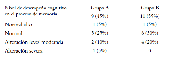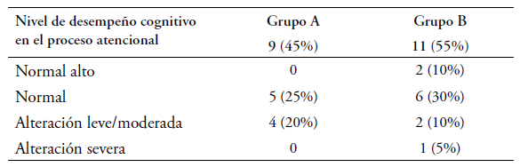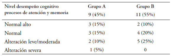 Al comparar puntuaciones en el desempeño de atención entre los grupos A y B, se evidenció una relación de 4 a 2 sujetos con alteración en este proceso cognitivo, por lo cual se demuestra que existe mayor implicación en sujetos del grupo A (con TEPT), que puede asociarse a la presencia de este trastorno, como se observa en la tabla 2.