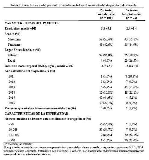 Se incluyeron las historias de 179 pacientes elegibles diagnosticados con varicela primaria entre 2011 y 2016; las características iniciales se resumen en la tabla 1.