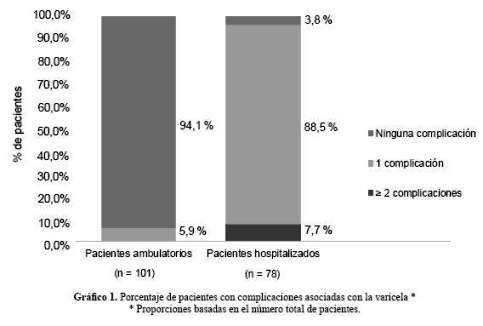 Las complicaciones de la varicela fueron más frecuentes en los pacientes hospitalizados. El 88,5 % de los pacientes hospitalizados (n = 69/78) presentó una complicación de varicela, y el 7,7% (n = 6/78) presentó≥2; en comparación de los pacientes ambulatorios 5,9% (n = 6/101) informaron solo una complicación de la varicela (gráfico 1). Todas las complicaciones de la varicela en pacientes ambulatorios (n = 6/6) se identificaron como infección de piel y tejido blando. De las complicaciones informadas en pacientes hospitalizados, la mayoría fueron infección de la piel y del tejido blando (75,3%), seguido de neumonía (6,2 %), complicaciones neurológicas (6,2%: incluye encefalitis 3,7% y cerebelitis 2,5%). El restante de las complicaciones (12,3%) fueron artritis séptica (2,5%), trastornos musculo esqueléticos y del tejido conectivo (2,5 %), sepsis (1,2%), trastorno de coagulación (1,2%), deshidratación (1,2%), trastornos renales y urinarios (1,2%), y trastornos de la piel y del tejido subcutáneo (1,2%) y otros (1,2%).
