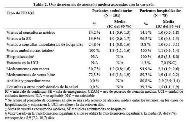 El uso de recursos de atención médica (URAM) para los casos de varicela y sus complicaciones incluyó: total de visitas de pacientes ambulatorios; visitas al consultorio del médico, a la sala de emergencias (SE) o al consultorio del hospital; hospitalizaciones y estadía en la unidad de cuidados intensivos (UCI); uso de medicamentos de venta libre y con receta; análisis y procedimientos realizados y consultas a profesionales de la salud no médicos. Con base en el URAM y la pérdida de ingresos de los cuidadores, los costos directos e indirectos se calcularon para los casos de varicela ambulatorios y hospitalizados, y se usaron para estimar el costo total anual debido a la varicela.