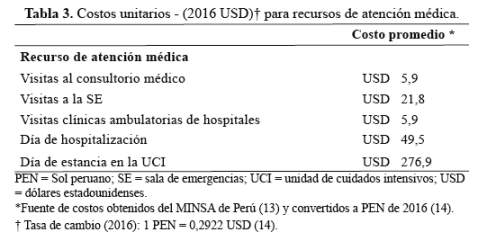 El costo directo del URAM se determinó multiplicando la cantidad de recursos utilizados por paciente por el costo unitario de cada recurso, tal como se obtiene del MINSA (13), y ajustado en soles de Perú (PEN) a 2016 (14). Los costos indirectos se calcularon como la pérdida de ingresos, en días de trabajo, de los cuidadores a cargo de los niños infectados con varicela, mediante la utilización de las estadísticas de ingresos promedio nacionales (15). Se estimó la pérdida de ingresos por días de trabajo como el total de días transcurridos en el hospital o la UCI para pacientes hospitalizados durante este estudio, y 2,5 días para pacientes ambulatorios, tal como se estimó en estudios anteriores (16).