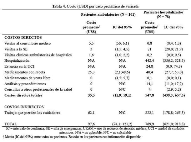 La tabla 3 muestra el costo unitario de los recursos de atención médica clave utilizados en el cálculo de costos directos por caso de varicela mostrados en la tabla 4, para pacientes ambulatorios y pacientes hospitalizados por tipo de recurso utilizado en el cual se muestra que el costo total (directo + indirecto) promedio (DE) estimado por caso de varicela fue de 97,6 USD (74,1; 121,2) y 769,9 USD (621,0;918,8), para pacientes ambulatorios y hospitalizados, respectivamente.