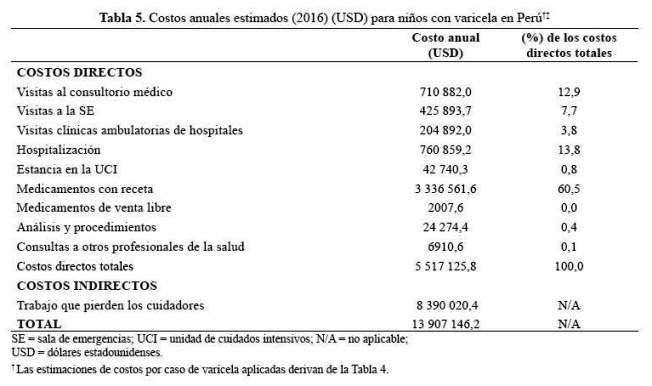 El costo anual estimado asociado con la infección por varicela pediátrica en 2016 para Perú se presenta en la tabla 5. De un total de 130 612 casos de varicela estimados que buscaron atención médica (1720 pacientes hospitalizados y 128 892 pacientes ambulatorios), se estimó que los costos directos e indirectos totales fueron de 5 517 125,8 USD y 8 390 020,4 USD, respectivamente, para un total de 13 907 146,2 USD.