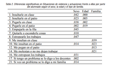 Concretamente, los niños presentan medias superiores en los ítems referentes a presenciar y sufrir violencia,mientras que las chicas tienen una mayor tendencia a solicitar ayuda si ven una situación de acoso. Respecto ala edad y el tipo de familia, los más mayores presencian más situaciones violentas y aquellos que no pertenecen a familias biparentales clásicas sufren más este tipo de situaciones.