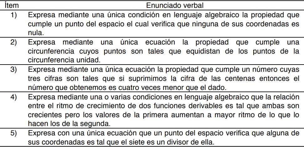 Para evitar equívocos se impuso la condición de no usar cuantificadores en las expresiones algebraicas; de lo contrario, algunos enunciados N pasarían a ser C. Por ejemplo, el ítem 1) podría considerarse de conversión directa si escribimos
