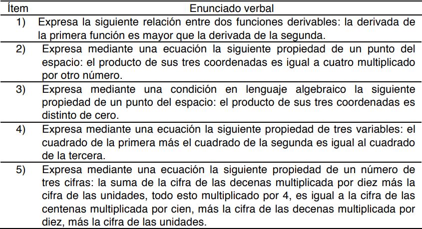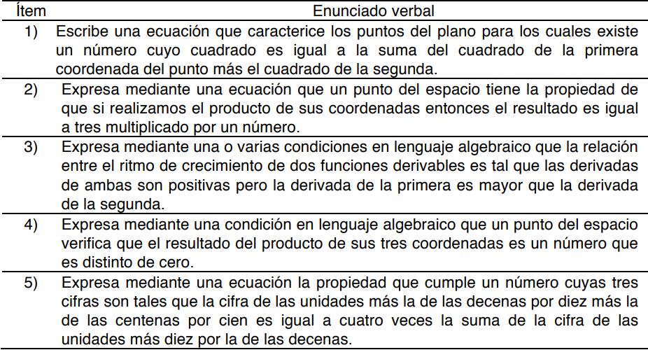 En este trabajo estudiamos desde un punto de vista cognitivo el paso del lenguaje natural al algebraico. Para ello proponemos a un grupo de sujetos la tarea consistente en realizar la conversión de los 20 enunciados verbales de un cuestionario. Analizamos la relación entre la competencia para manejar las estructuras sintácticas del lenguaje natural y la competencia para movilizar mentalmente resultados matemáticos no mencionados explícitamente en el enunciado pero necesarios para obtener la expresión algebraica. Se analizan también las dificultades de la tarea en función de las competencias requeridas. Los resultados serán aplicables al diseño de instrucción.