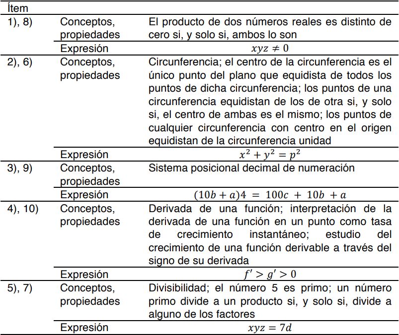 Para categorizar las respuestas, primero se analizó cada ítem para comprobar que se correspondía con el tipo asignado y se contrastó la clasificación con el criterio del panel de expertos. Incluimos en la Tabla 5 los conceptos y propiedades matemáticos implícitos en los de tipo N.