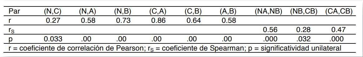 Sobre la correlación, al tener una expectativa a priori de relación creciente, aplicamos contrastes unilaterales. En el caso paramétrico, obtenemos en todos los pares una relación lineal significativa (Tabla 8). En el caso no paramétrico, obtenemos una relación monótona creciente en los pares incluidos en las tres últimas filas de la Tabla 8, mientras que aceptamos la hipótesis nula en los casos (NA,CA), (NA,CB) y (NB,CA).