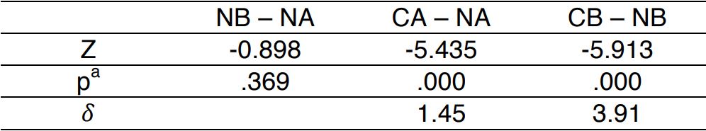 En cuanto a los contrastes de hipótesis sobre simetría de las distribuciones, los resultados indican que el valor absoluto del índice tipificado es menor que dos en todos los pares excepto en (CA,CB), donde para comparar los promedios usamos la prueba de los signos, que con una significatividad .001 nos lleva a rechazar la hipótesis nula de igualdad de medianas, con tamaño del efecto δ=1.13. Por la prueba de Kolmogorov-Smirnov, usamos la prueba de Wilcoxon para los pares (NA,CA), (NA,NB) y (NB,CB). Empleamos la t-Student para (N,C) y (A,B). Por la prueba de Wilcoxon (Tabla 7) rechazamos la igualdad de medianas para (NA,CA), (NB,CB).