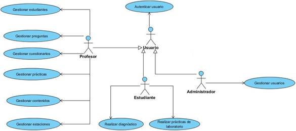 La presente sección describe los componentes fundamentales de la propuesta de Sistema de Laboratorios Remoto. La propuesta cuenta tres actividades fundamentales: diseño de controladores, identificación de sistemas y ejecución de prácticas en sistemas físicos. El ambiente de trabajo generado incorpora un escenario donde los estudiantes pueden enfrentarse al desarrollo de las prácticas donde se recree un ambiente homólogo a la realidad. El diseño del Sistema de Laboratorios Remoto se ha modelado mediante cuatro actores fundamentales que agrupan los principales Casos de Uso del Sistema. La Figura 1 muestra el Diagrama de Caso de Uso del sistema propuesto.